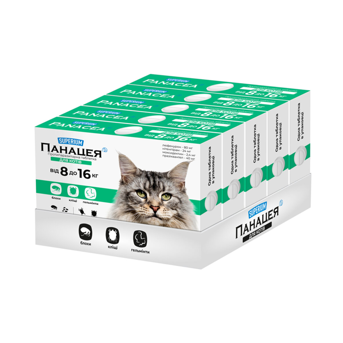 SUPERIUM Панацея – протипаразитарний засіб у формі таблетки, розроблений для комплексного захисту котів від зовнішніх і внутрішніх паразитів. Забезпечує системну дію та може застосовуватись для регулярної профілактики і лікування інвазій.