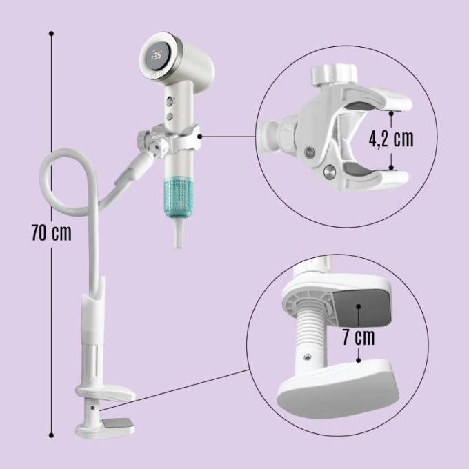 - Тримач оснащений регульованим затискачем, що дає змогу легко налаштувати фен на ідеальну висоту та кут нахилу для комфорту вашого улюбленця. Гнучка підставка забезпечує стабільність під час сушіння вашого улюбленця, пропонуючи плавне позиціонування відповідно до різних розмірів тіла та потреб у сушінні.