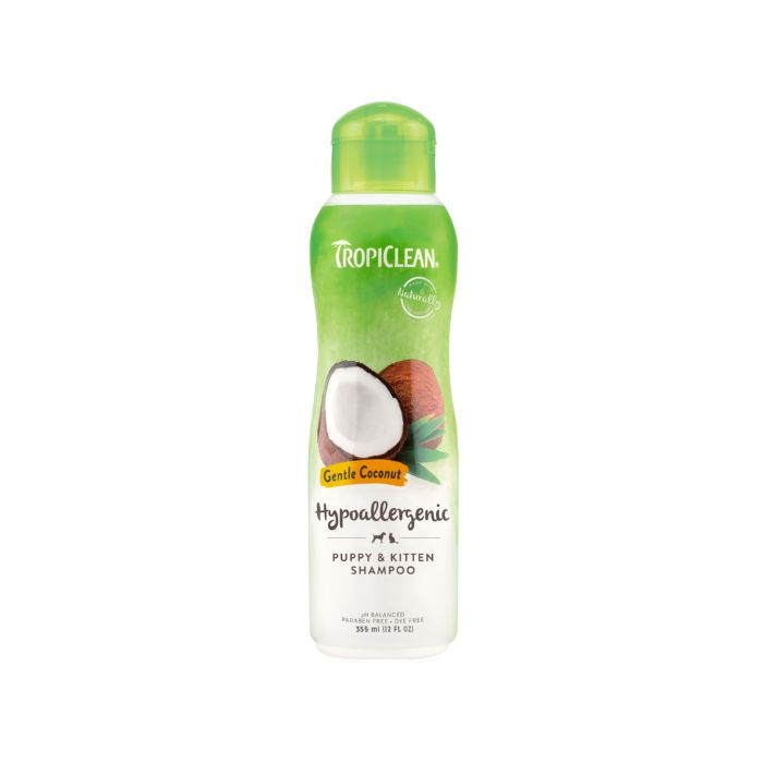 Гіпоалергенний шампунь TropiClean «Ніжний кокос» створений для делікатного догляду за шерстю цуценят і кошенят, а також дорослих домашніх тварин із чутливою шкірою.