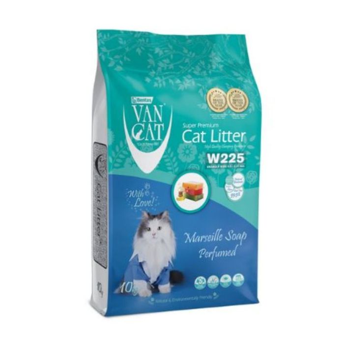 Наповнювач для котячих туалетів VanCat виготовлений з натурального білого бентоніту (природний глинистий мінерал), активованого за допомогою кальцинованої соди із застосуванням подвійного просіювання для усунення пилу.