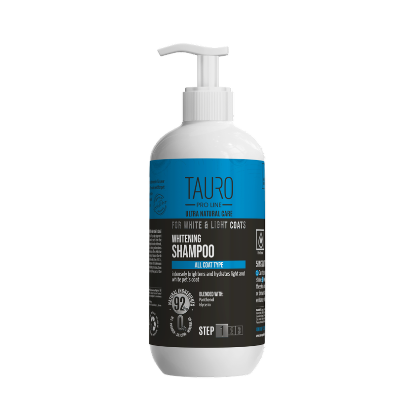 Відбілювальний шампунь для собак і котів із білим і світлим забарвленням шерсті TAURO PRO LINE Ultra Natural Care Whitening Shampoo – забезпечує належне зволоження та підтримку природного білого кольору шерсті.