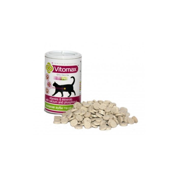 Вітамінний комплекс для зміцнення зубів і кісток у котів Vitomax забезпечує організм улюбленця фосфором і кальцієм, необхідними для здоров’я опорно-рухового апарату та зубів.
