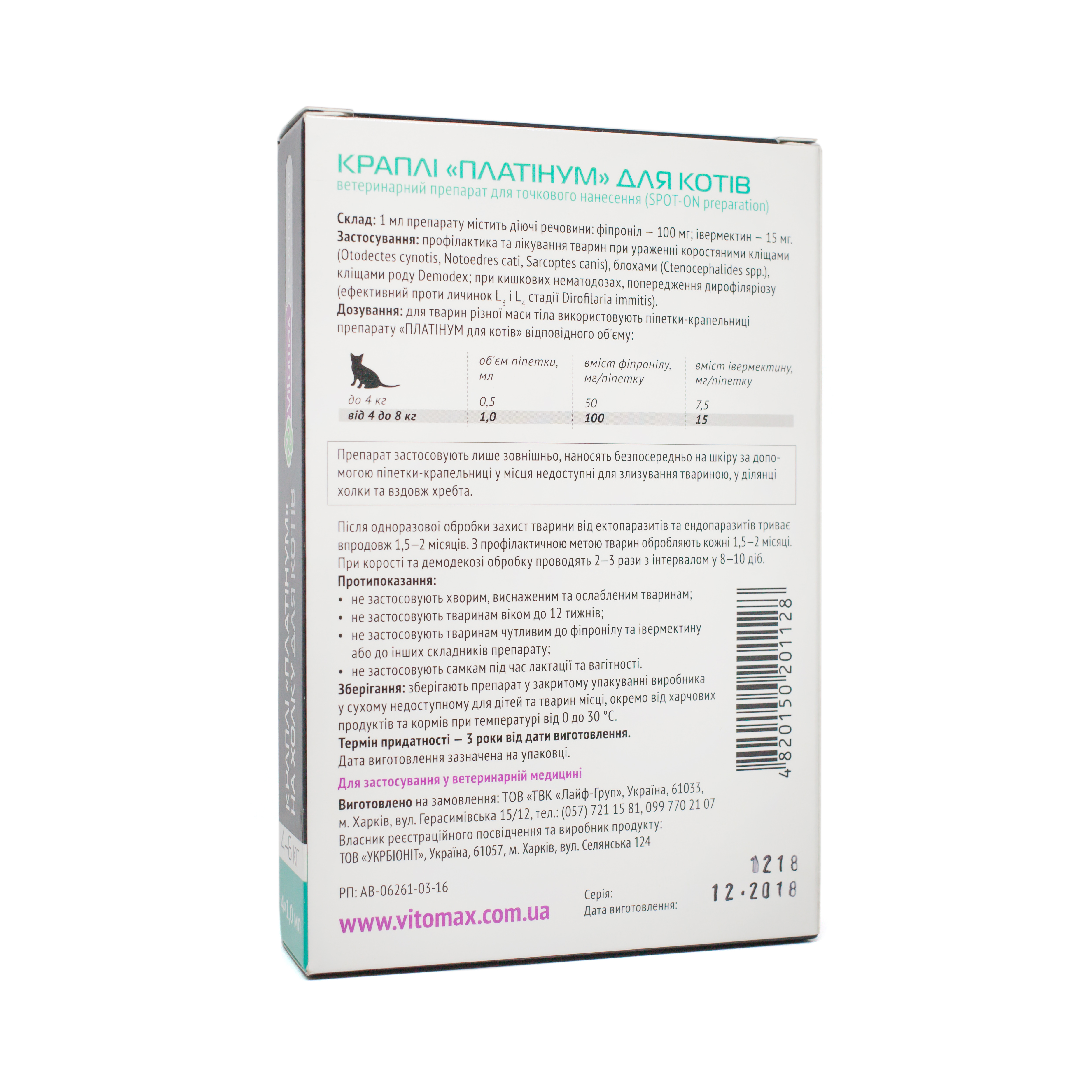 Краплі Vitomax Platinum ефективні проти іксодових кліщів, бліх і гельмінтів. Також застосовуються для лікування демодекозу, отодектозу, саркоптозу, нотоедрозу. Краплі збираються в фолікулах шерстяного покриву та, поступово вивільняючись, знищують паразитів.