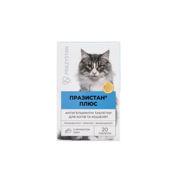 Празистан Плюс — комбінований антигельмінтний препарат широкого спектра дії, у складі якого присутні фенбендазол, пірантелу памоат і празиквантел. Засіб ефективно та швидко знищує більшість гельмінтів, що паразитують у дорослих котів і кошенят. Працює з усіма стадіями розвитку круглих і стрічкових черв'яків, лямблій, анкілостом й найпростіших гельмінтів, запобігаючи зараженню улюбленців. Празистан Плюс зі смаком сиру представлений у формі таблеток із розділовою смугою, завдяки чому їх зручно ділити на дози та згодовувати тваринам.