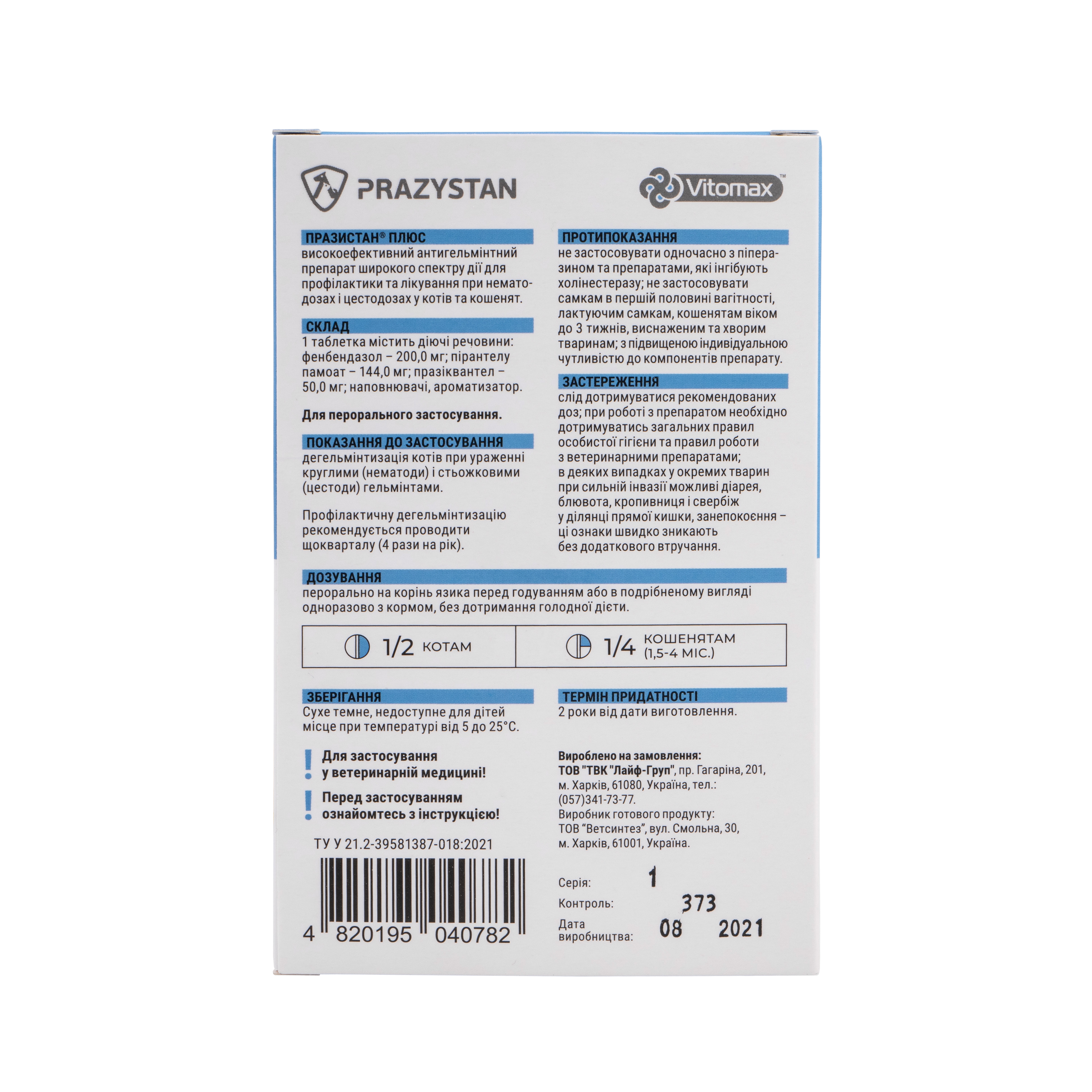 - 1 таблетка препарату Празистан+ розрахована на вагу від 5 до 10 кг (на вагу до 2 кг – 1/4 таблетки, на вагу 2-5 кг – 1/2 таблетки).