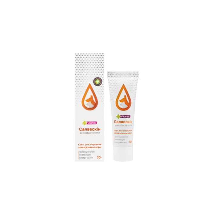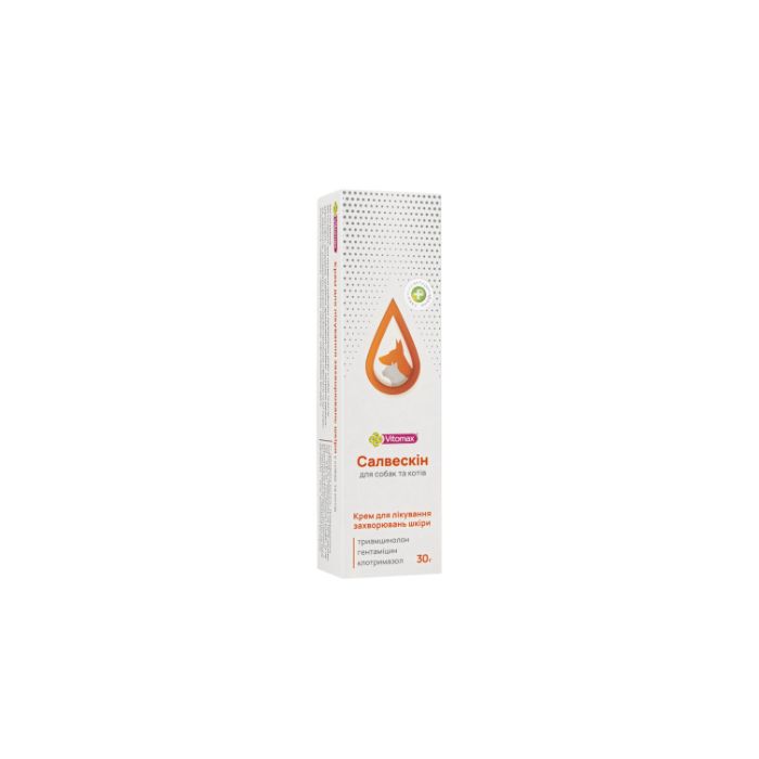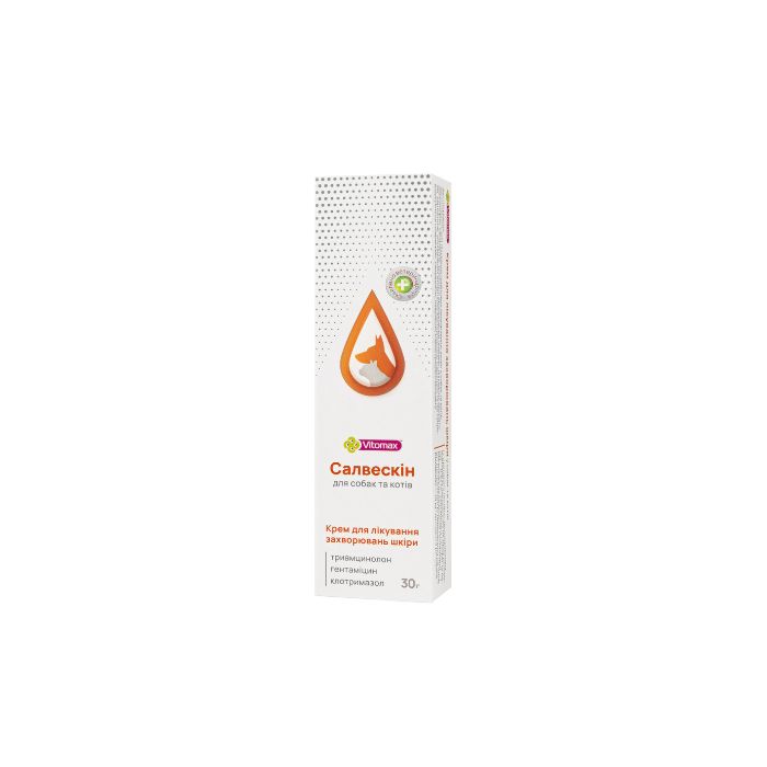Крем Vitomax САЛВЕСКІН – ефективний засіб для лікування захворювань шкіри у собак і котів. Завдяки комбінації діючих речовин препарат має антибактеріальну, протигрибкову, протизапальну, антиалергічну дії.