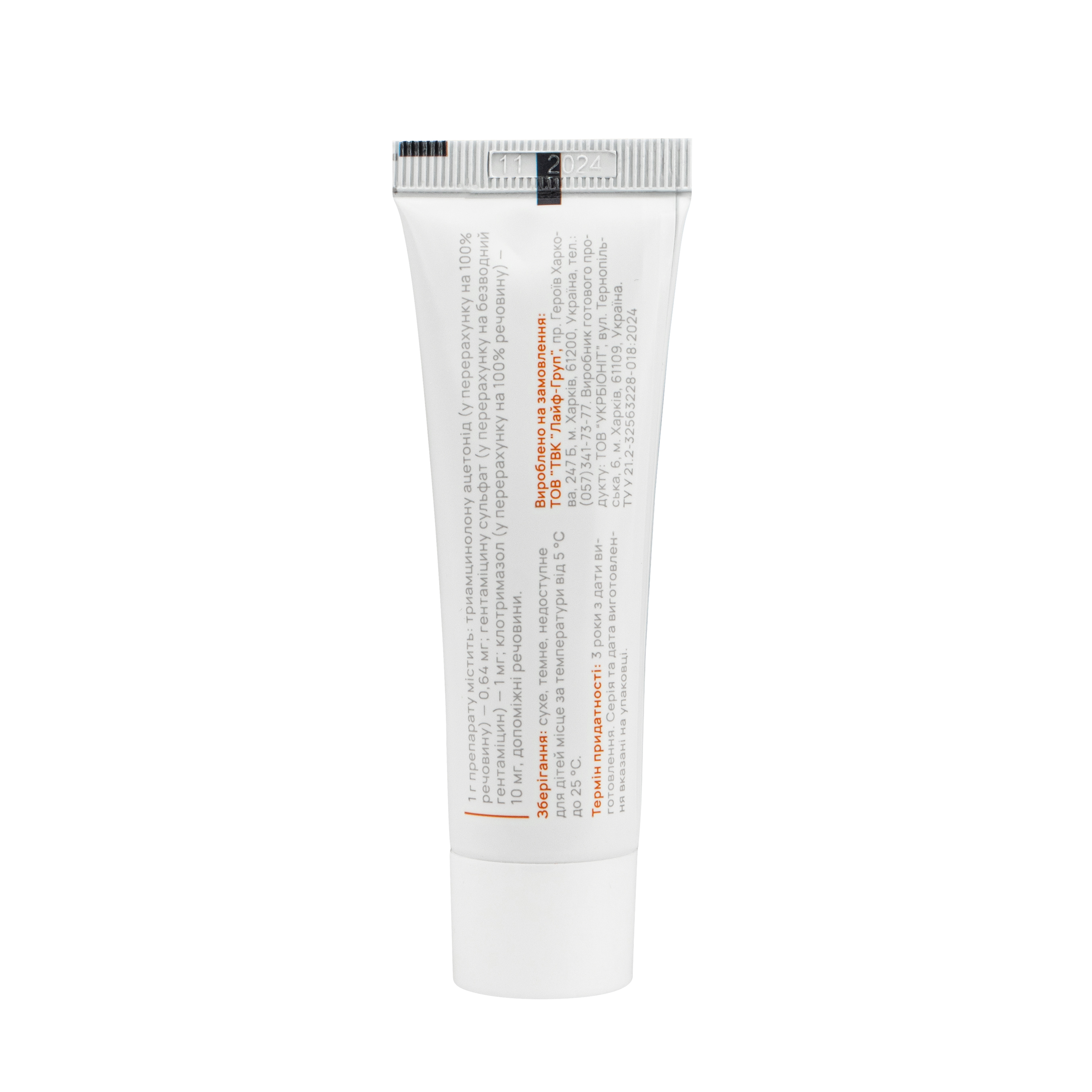- діючі речовини: триамцинолону ацетонід (у перерахунку на 100% речовину) 0,64 мг, гентаміцину сульфат (у перерахунку на безводний гентаміцин) 1 мг, клотримазол (у перерахунку на 100% речовину) 10 мг;