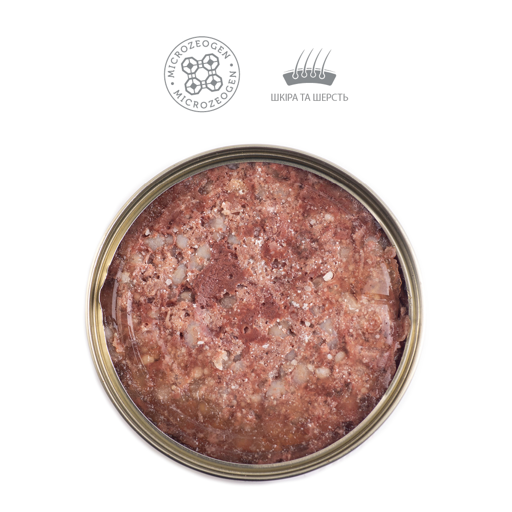 Склад: м'ясо та субпродукти тваринного походження (67% баранина), крупи (3% рис), мінеральні речовини 1% (0,1% кліноптилоліт), олії та жири (0,1% лляна олія).