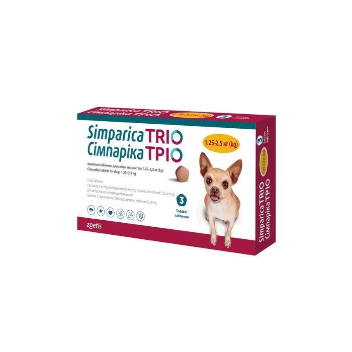 Simparica TRIO – протипаразитарний препарат для собак широкого спектру дії, який можна використовувати для лікування тварин віком від 8 тижнів, з масою тіла 1.3-2.5 кг 1 шт.